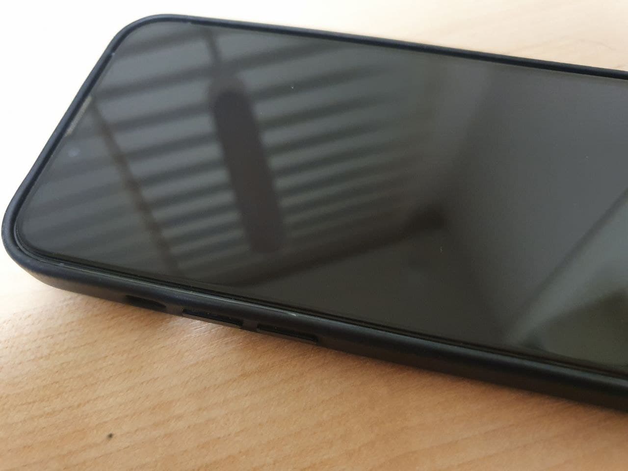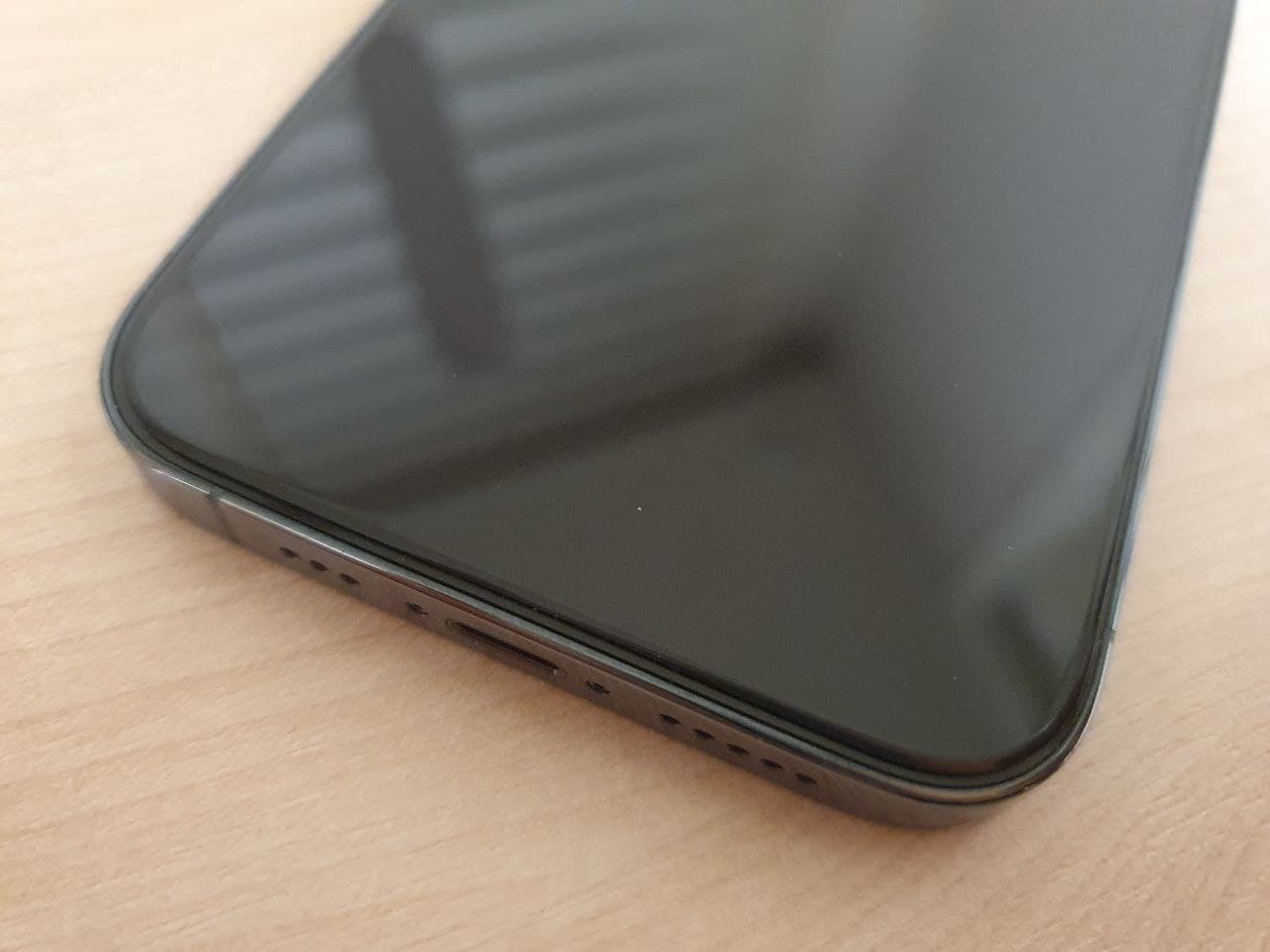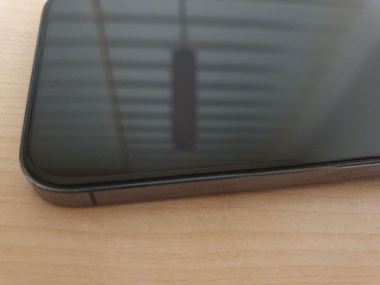 액정 테두리를 1mm 정도 여유를 두고 액정을 모두 덮어주기 때문에 케이스를 씌워도 간섭이 없습니다. 제가 말했던 부분이 위 사진에서 잘 보이는지 모르겠네요. 개인적으로 액정을 딱 맞게 보호해준다고 생각합니다. 또한 수화부 부분은 그릴 처리해서 신경쓴 부분도 좋았습니다. 강화유리필름을 붙인 상태에서 애플 정품 가죽 케이스를 씌워도 서로간에 간섭이 전혀 없기 때문에 강화유리필름 사이즈는 제 맘에 쏙 들었습니다.