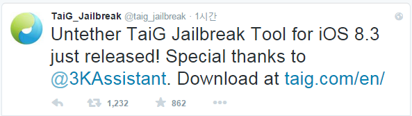 중국의 탈옥 팀, TaiG가 오늘 iOS 8.1.3 ~ iOS 8.3 완전 탈옥툴 TaiG Jailbreak Tool v2.0.0을 공개했습니다. iOS 8.4 정식버전이 나오기 전에 배포된 탈옥툴이라 탈옥할 분들은 iOS 8.4 정식버전이 배포되기 전에 탈옥을 하는 것이 좋을거 같습니다.^^