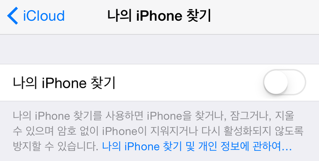 2. 탈옥할 기기의 설정>iCloud>나의 iPhone 찾기에서 나의 iPhone 찾기 버튼을 끕니다.