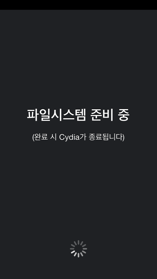 STEP4. 탈옥 완료 후 홈화면에 설치된 Cydia를 실행합니다. 그러면 아래와 같이 파일시스템 준비 중 이라는 화면이 나오고 잠시 후 기기가 재부팅 됩니다. 그리고 다시 Cydia를 실행해보면 정상적으로 실행됩니다.