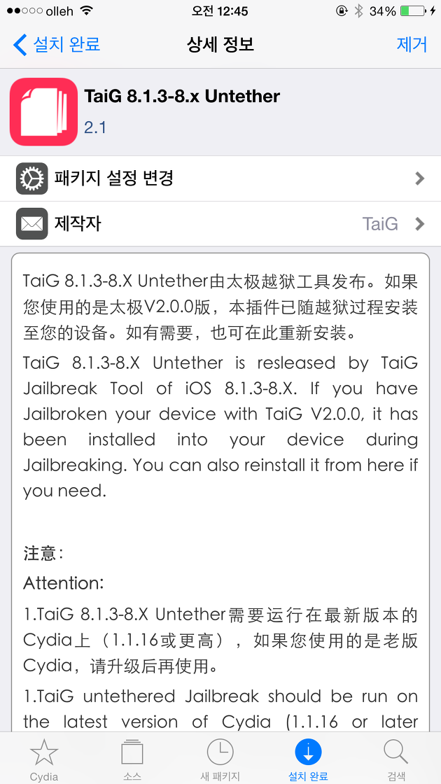 이렇게 탈옥툴 버전을 v2.1로 업데이트한 후 시디아에서 TaiG 8.1.3-8.x Untether를 확인해 보면 2.0→2.1로 업데이트 된 것을 확인할 수 있습니다.
