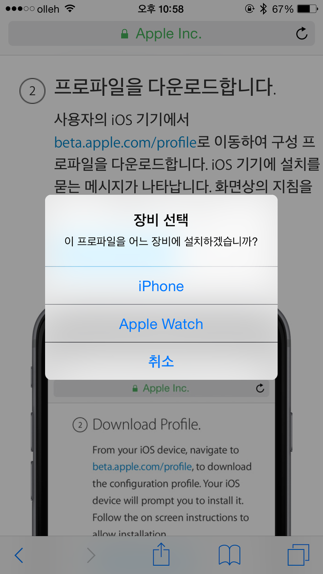 STEP4. 화면 중앙의 프로파일 다운로드 버튼을 터치합니다. 저는 애플워치와 연결되어 있어 아래와 같이 장비 선택 화면이 나오네요.^^