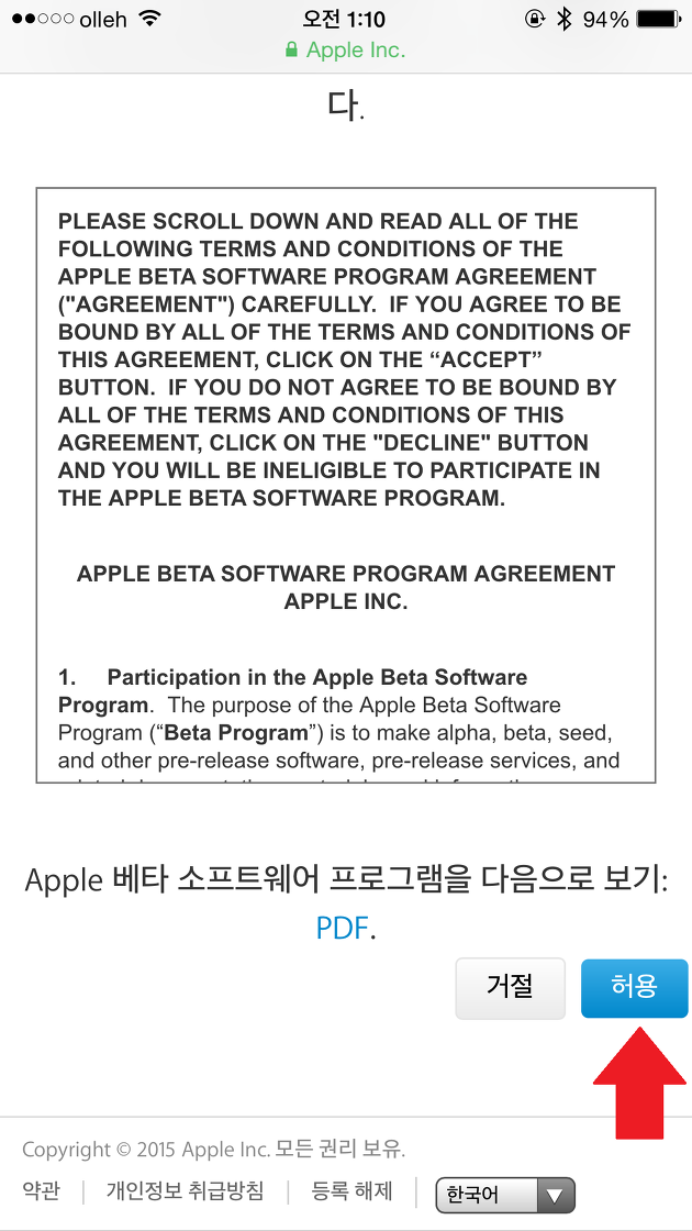 STEP2. Apple 베타 소프트웨어 프로그램 페이지에서 등록 버튼을 누릅니다. 그리고 자신의 애플 ID로 로그인하면 계약 페이지로 넘어가는데요. 화면을 밑으로 내려 허용 버튼을 눌러 줍니다.