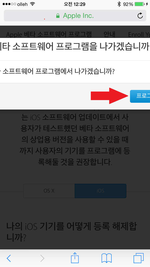 그러면 아래와 같이 Apple 베타 소프트웨어 프로그램에서 성공적으로 나간 화면을 볼 수 있습니다.^^