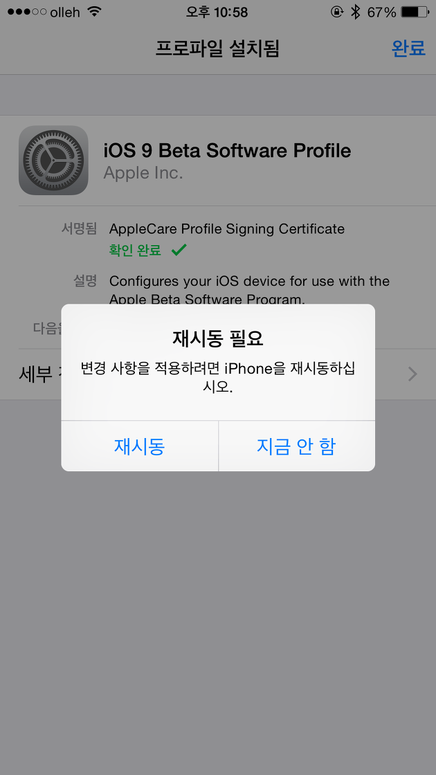 STEP6. 프로파일 설치 동의 화면 입니다. 화면 상단 오른쪽의 설치 버튼을 누르면 프로파일이 설치됩니다. 그리고 재시동을 터치합니다.