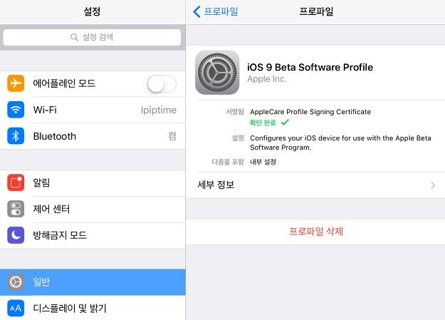 STEP1. iOS 9 퍼블릭 베타 1이 설치된 기기의 설정>일반>프로파일로 들어가면 아래와 같은 화면을 볼 수 있습니다. 거기서 프로파일 삭제를 터치해 iOS 9 Beta Software Profile을 삭제합니다.