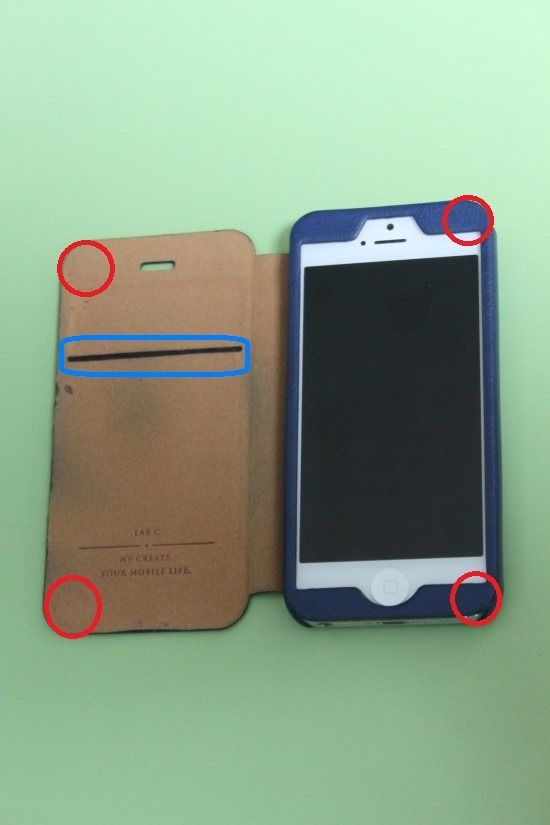 처음에 케이스를 샀을때는 자석이 약한가 싶을정도로 힘이 없었는데 2개월사용한 지금은 가죽의 힘이 좀 죽어서 그런지 자석힘이 세진것 같은 느낌이 듭니다. ^^; 왼쪽 커버의 파란색 동그라미 부분은 카드를 수납할수 있는 공간입니다. 카드를 넣은 상태에서도 커버가 잘 닫힙니다.(자세한 그림은 아래 제품설명그림을 보세요..^^ 저는 카드를 잘 안 넣고 다녀서...^^;)