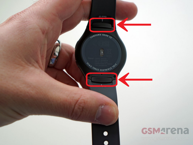 아래의 그림과 같이 시계 뒷면의 시곗줄 연결부위 부분을 눌러주면 시곗줄을 뺄 수 있으며 교체할 수 있는 시곗줄도 다양합니다. 이부분은 애플워치와 비슷해 보입니다.^^(삼성도 시곗줄 장사를 하려는 걸까요? ㅎㅎ)