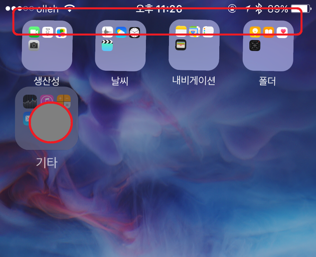 Step2. 홈화면의 앱 아이콘이나 폴더를 길게 누르고 있으면 앱 또는 폴더를 다른 곳으로 이동할 수 있는 편집모드가 됩니다. 이때 '폴더 안으로 들어갈' 폴더를 누른 상태에서 '폴더를 받을' 폴더의 윗 부분과 상태바 부분을(빨간네모박스)계속 터치합니다.