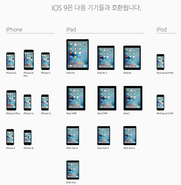 이번에 배포된 iOS 9.1 버전의 빌드넘버는 13B143이며, 업데이트할 수 있는 기기는 아래와 같습니다.