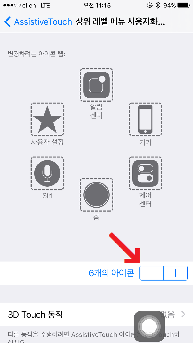 Step2. 설정>일반>손쉬운 사용>AssistiveTouch>상위 레벨 메뉴 사용자화...로 들어가면 아래와 같은 화면이 나오는데요. 6개의 아이콘을 ㅡ 버튼을 눌러 1개로 줄여줍니다.
