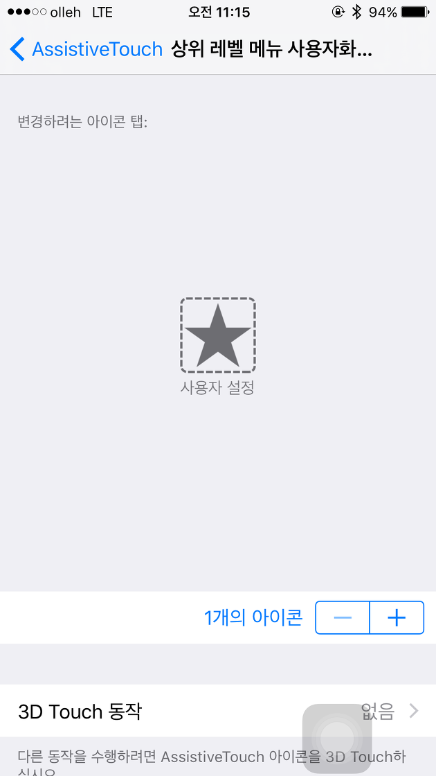 Step3. 1개 남은 사용자 설정(★)을 터치해 이것을 홈으로 바꿔줍니다. 그러면 이제부터 홈화면에 보이는 Assistive Touch를 터치하면 홈버튼을 누른 것과 같은 효과를 낼 수 있습니다. 연속 두 번 누르면 멀티태스킹 화면으로 전환되며 전원버튼과 같이 누를 경우 화면 캡쳐도 됩니다. 즉, 물리적 홈버튼과 똑같이 사용할 수 있게 됩니다.