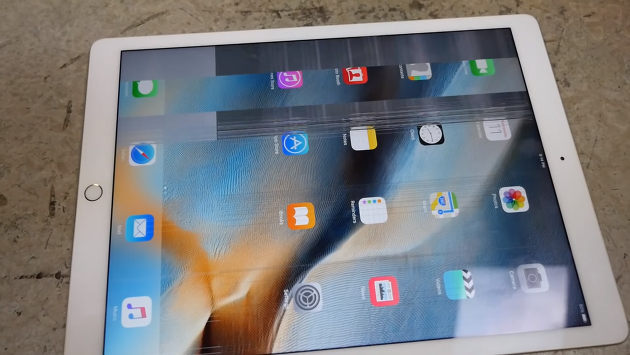 그래서 2번째로 진행한 드롭테스트에서는 낙하 높이를 성인 남성 얼굴 높이로 올려서 진행하는데요. 후면 낙하로 시작한 2번째 드롭 테스트 결과는 허리 높이에서 진행했을 때와는 달랐습니다. 낙하 후 아이패드 프로 화면이 아래와 같이 고장을 일으켰으며 화면 터치도 작동 되지 않았습니다.