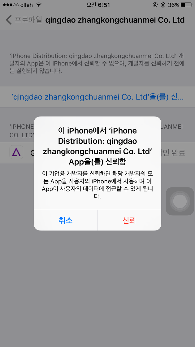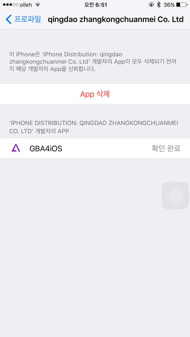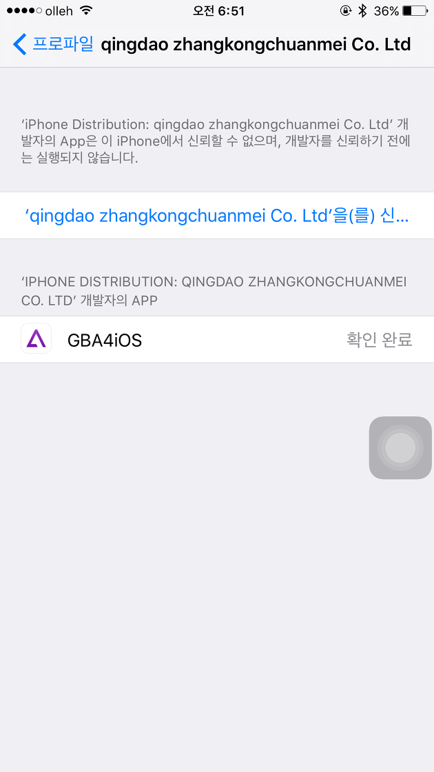 STEP3. 설정>일반>프로파일>qingdao zhangkongchuanmei Co. Ltd로 이동한 다음 'qingdao zhangkongchuanmei Co. Ltd'을(를) 신...을 터치하면 팝업창이 뜨는데요. 신뢰를 터치하면 홈화면에 설치된 GBA4iOS를 사용할 수 있습니다.