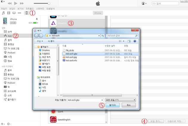 아이튠즈를 실행한 다음 아래 그림과 같이 순서대로 클릭 후 GBA4iOS 게임파일을 선택해 열기를 클릭하면 됩니다.
