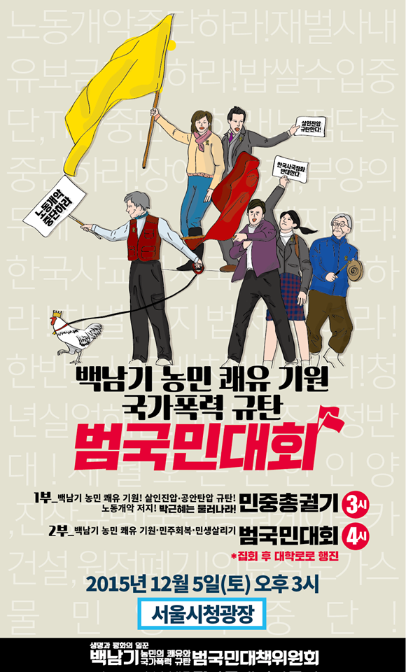 어제 서울행정법원이 '생명과 평화의 일꾼 백남기 농민의 쾌유와 국가폭력 규탄 범국민대책위원회(범대위)'가 낸 경찰의 12월 5일 2차 민중총궐기 집회 금지통고 집행정지 가처분 신청을 받아들였다는 소식을 전해드렸습니다.(관련글) 그로인해 예정대로 12월 5일에는 2차 민중총궐기 집회가 진행될 것입니다.
