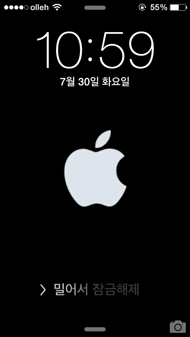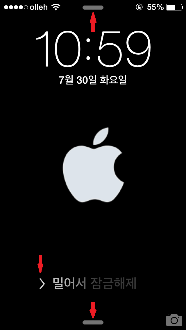 iOS6때와는 달리 밀어서 잠금해제 부분의 경계선이 없어지고 글자만 남아있으며, 아이폰을 처음 사용하는 사람은 어느방향으로 밀어야 하는지 모를 수 있기 때문에 개선된 사항 같습니다. 또한, 카메라 버튼을 터치하면 화면전체가 위로 살짝 올라갔다 원위치로 돌아옵니다.