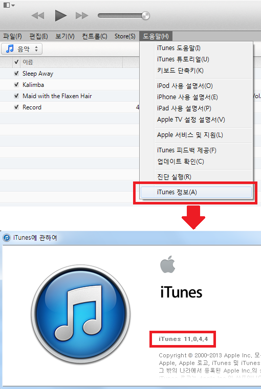 1. 컴퓨터에 iOS 기기를 연결 후 iTunes를 실행합니다. 그리고 iTunes 버전정보를 확인합니다. 2013.7.30 현재 최신버전은 v11.0.4 입니다.