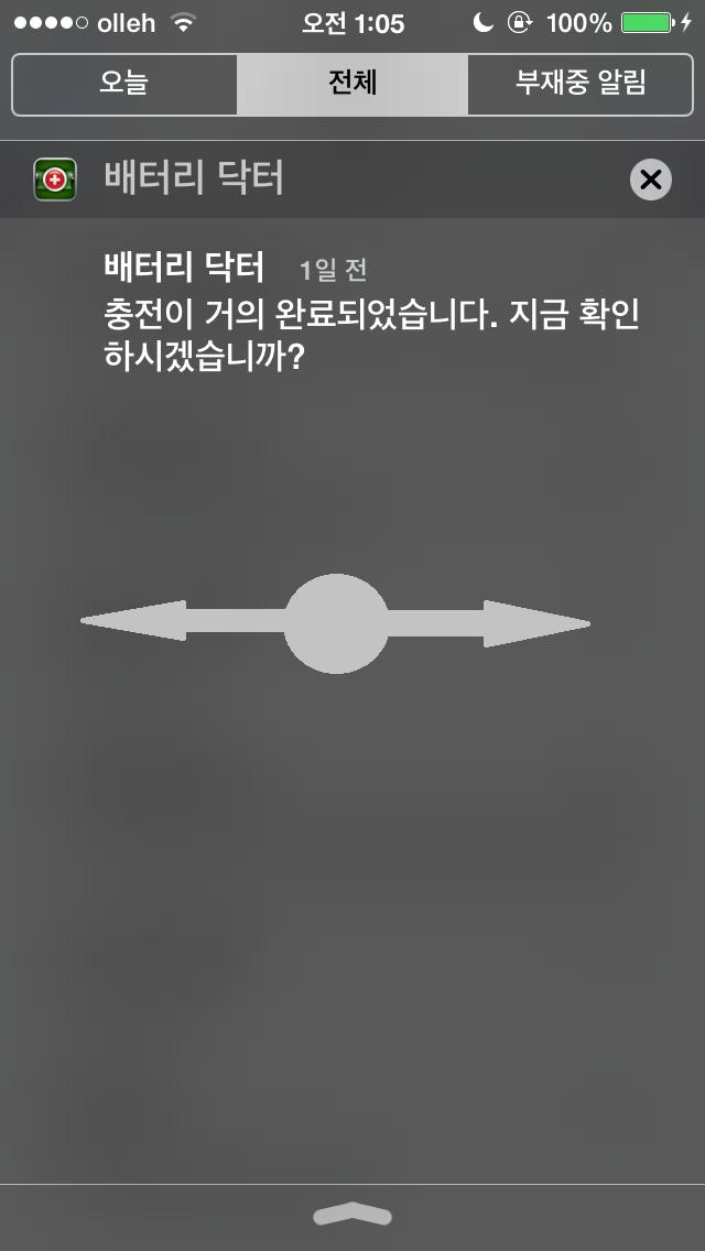 알림센터에서 화면을 좌, 우로 스와이프(슬라이드)하면 오늘/전체/부재중알림으로 왔다갔다 이동할 수 있습니다.
