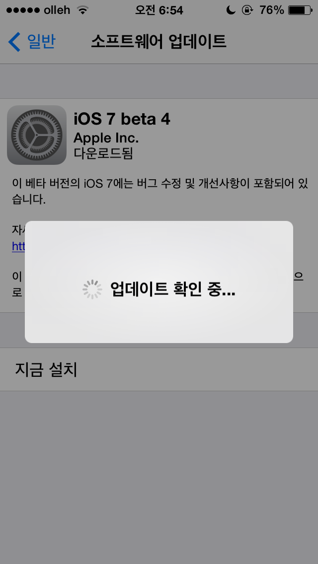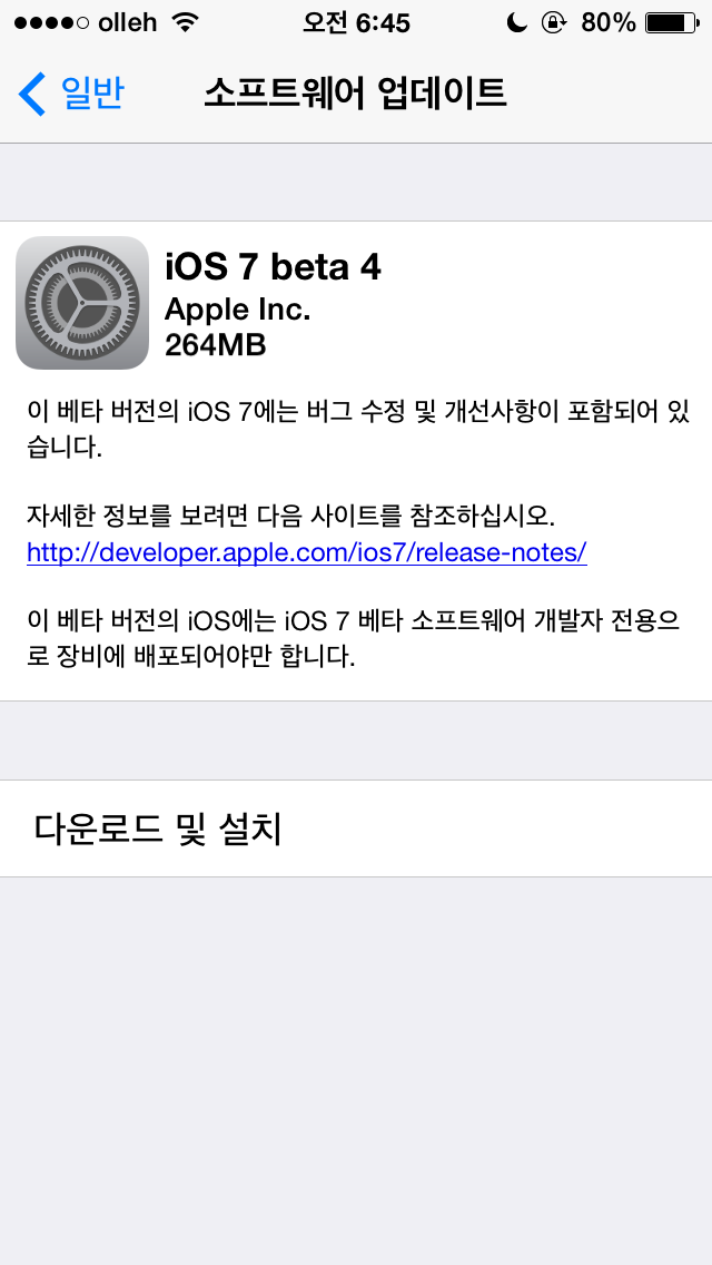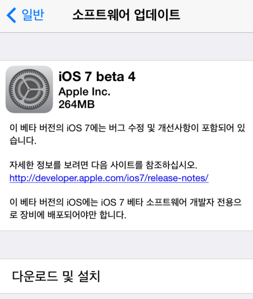 이미 iOS 베타1~베타3을 사용하고 있는 분은 iOS기기의 설정-일반-소프트웨어 업데이트-다운로드 및 설치를 터치하면 iOS7 베타4로 업데이트가 진행됩니다.