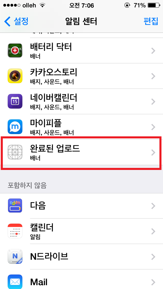 iOS 기기의 설정-알림센터에 가보니 완료된 업로드 라는 알림이 하나 생겼습니다. 이 알림은 어느 상황에서의 알림인지 모르겠습니다. ^^;;