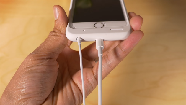 또한 케이스를 끼운 상태에서 이어폰으로 음악을 듣는 것도 문제입니다. 아래 사진과 같이 정품 이어폰에 딱 맞게 설계된 케이스 때문인데요. 아이폰6s 스마트 배터리 케이스 헤드폰 단자의 지름이 약 7mm이고 아이폰6s와 연결하는데까지의 공간이 약 10mm이기 때문에 이어폰 또는 헤드폰 플러그 끝부분이 굵은 경우 사용하지 못할 수 있습니다. 게다가 케이스를 끼운 아이폰6s의 무게는 약 242g이나 될 정도로 무거워 집니다.