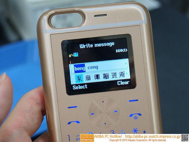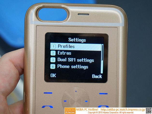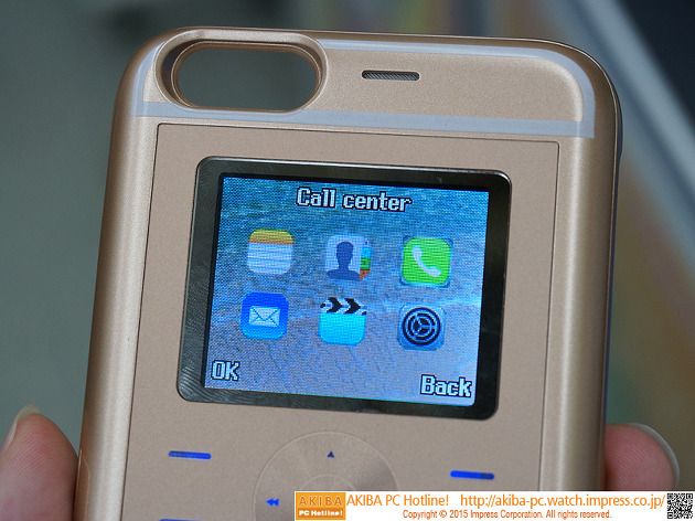 케이스 겉면에는 여느 피쳐폰과 같이 전화 키패드가 있으며, 컬러 액정에는 6개의 앱 아이콘이 보이지만 터치 기능은 없다고 합니다. 전화 키패드에 있는 방향키로 조작하는 거라고 하네요. 가장 주목할만한 점은 케이스 단독으로 통화나 메시지도 가능하다는 건데요.