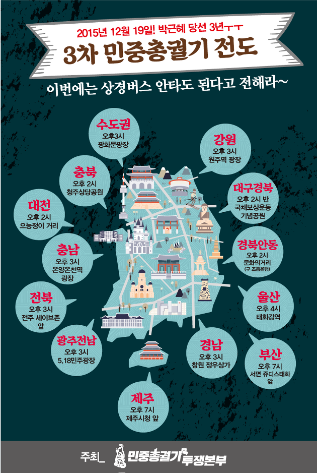 이번 3차 민중총궐기 집회는 아래와 같이 전국 13개 지역에서 열리기 때문에 서울 상경버스를 안타도 됩니다. 뜻이 있다면 어느 곳에서나 참여할 수 있으니 전국 각지의 집회 장소 및 시간을 잘 확인하시기 바랍니다.