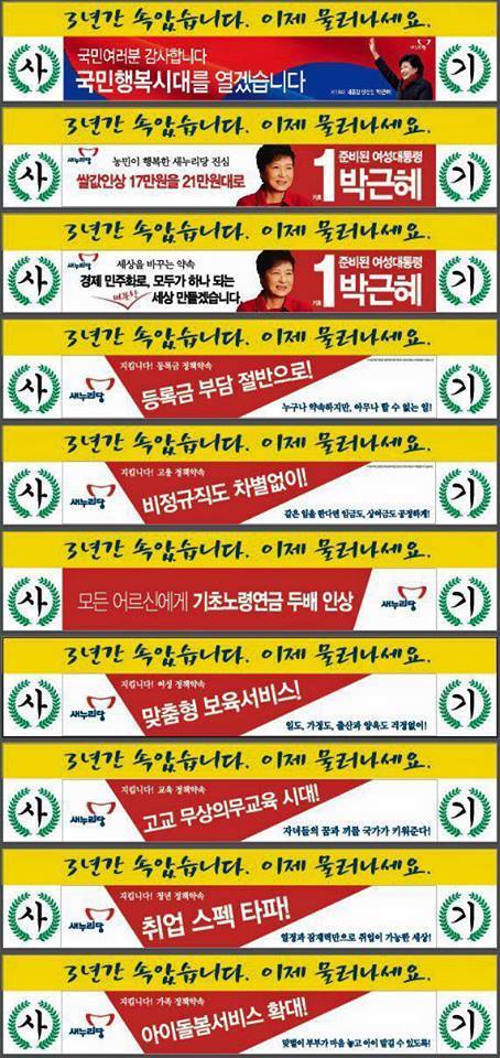 제목에서 밝혔듯 오늘은 박ㄹ혜 당선 3년 되는 날이기도 합니다. 전국 13개 지역 민중총궐기 대행진에서 박ㄹ혜의 공약 현수막 행진이 진행될 예정이라고 하는데요. 현수막 내용은 아래와 같습니다.