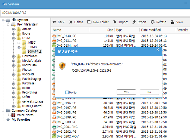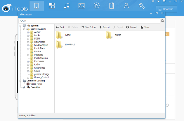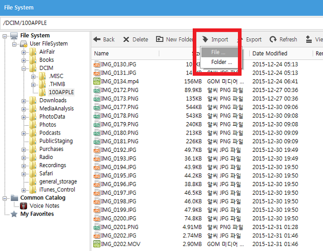Step8. iTools에서 아래 그림과 같이 Import>File ...을 클릭합니다. 그리고 Step7의 영상과 이미지 파일을 선택해 아이폰으로 복사합니다.