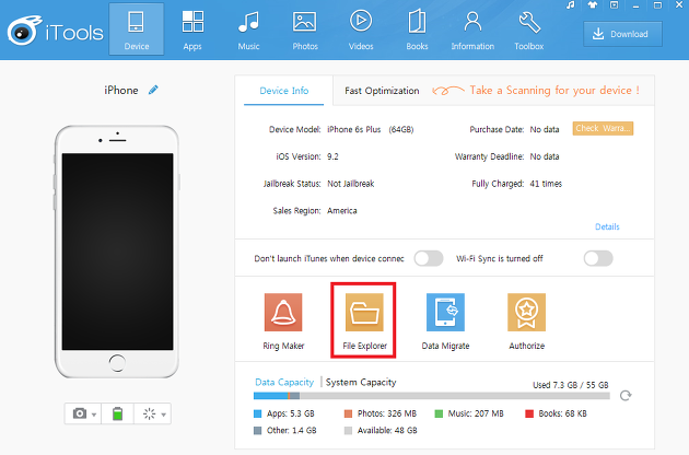 Step5. PC와 아이폰을 연결한 후 Step2에서 설치한 iTools를 실행합니다. 아래는 실행 첫 화면인데요. File Explorer를 클릭합니다.