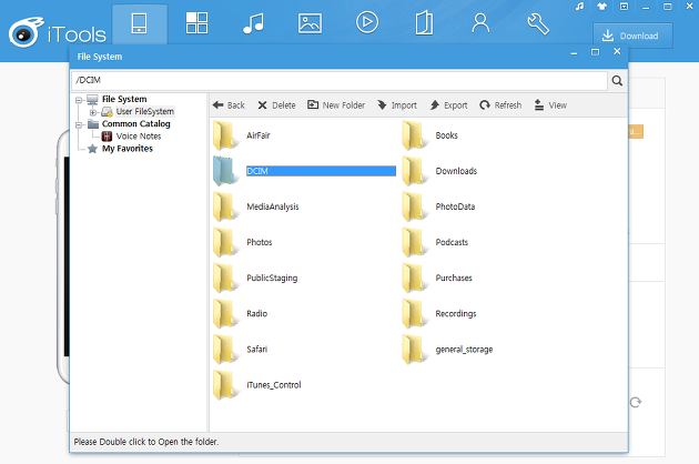 그러면 아래와 같이 File System이라는 팝업창이 하나 나타납니다. 거기서 DCIM 폴더를 더블 클릭합니다.