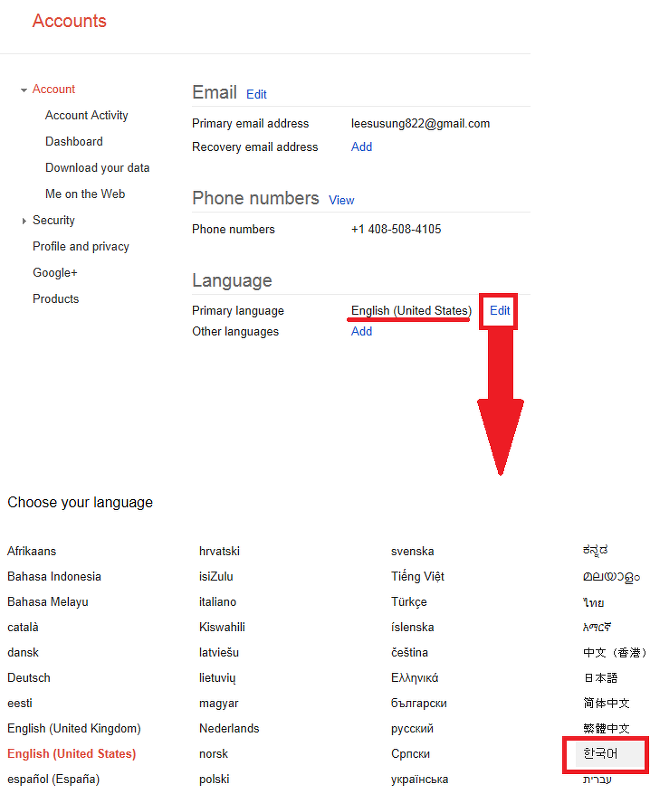 만약, 계정 설정 화면이 영어로 나와 불편하신 분들은 아래 그림처럼 언어를 한국어로 설정한 후,