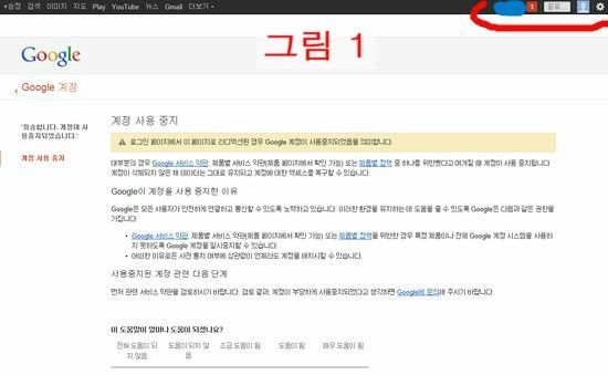 2. 구글 계정을 새로 만드는 과정에서 계정 사용 중지라는 화면이 나옴.(그림 2 참고)