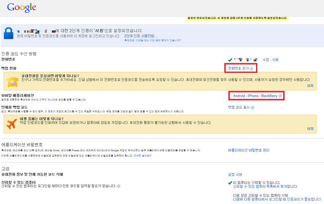 만약을 대비해 위 그림의 빨간네모박스 부분을 눌러 백업 전화번호를 설정해 주세요. 그러면 2단계 인증 과정이 완료된 겁니다.