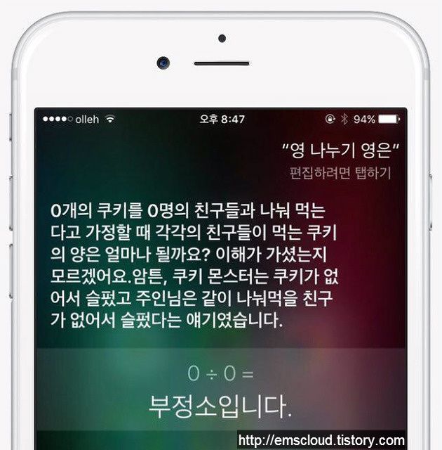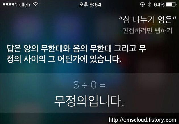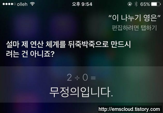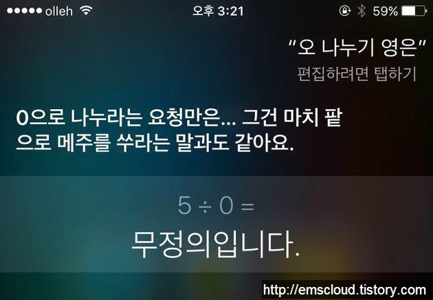 해외 트위터 이용자들의 재밌는(?) 반응들이었습니다. 저는 한발 더 나아가 0 나누기 0 뿐만 아니라 '0으로 나누기'를 몇 개 더 물어봤는데요. 시리는 '0으로 나누기' 에 대한 히스테리적 반응을 보였습니다. ^^