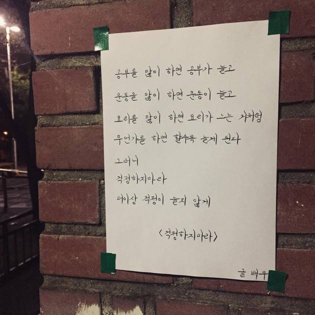 SNS 시인, 글배우(김동혁)의 시 중 하나를 담아왔습니다. 제목은 걱정하지마라 인데요. 저도 더이상 걱정하지 않는 버릇을 들여야겠네요. 걱정이 늘지 않게 말이죠..^^