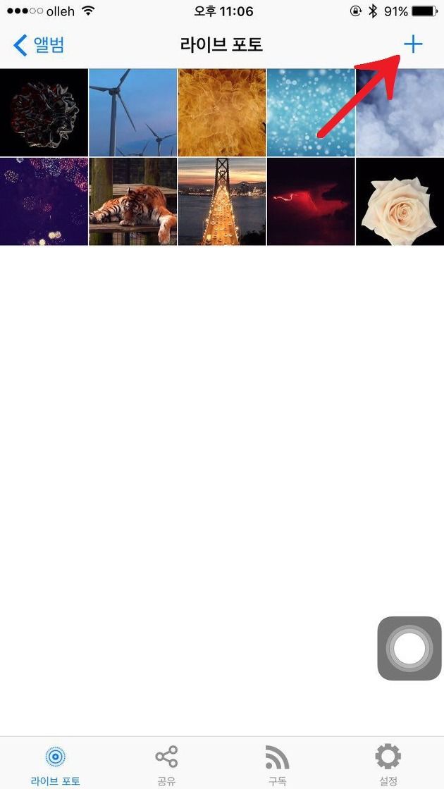 Step1. 쉐어 라이브를 실행한 후 화면 상단 오른쪽의 +를 터치하고 사진 라이브러리를 선택합니다.