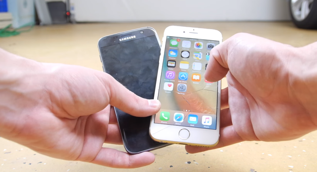 주목할 만한 점은 6m 높이에서 전면 낙하를 해도 아이폰6s 플러스의 액정은 멀쩡했으나 갤럭시 S7 엣지는 파손되었다는 점이며, 특히 전면보다는 후면의 파손이 심했습니다. 실험 결과 갤럭시 S7 엣지의 패배였습니다.
