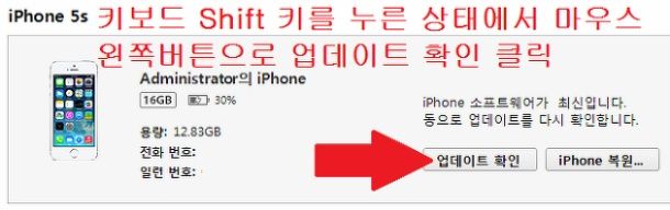 컴퓨터에 애플 기기를 연결한 다음 아이튠즈에서 Shift + 업데이트 확인을 클릭합니다. 그리고 위에서 다운받은 펌웨어를 선택하면 업데이트가 진행됩니다.(아래그림참고)