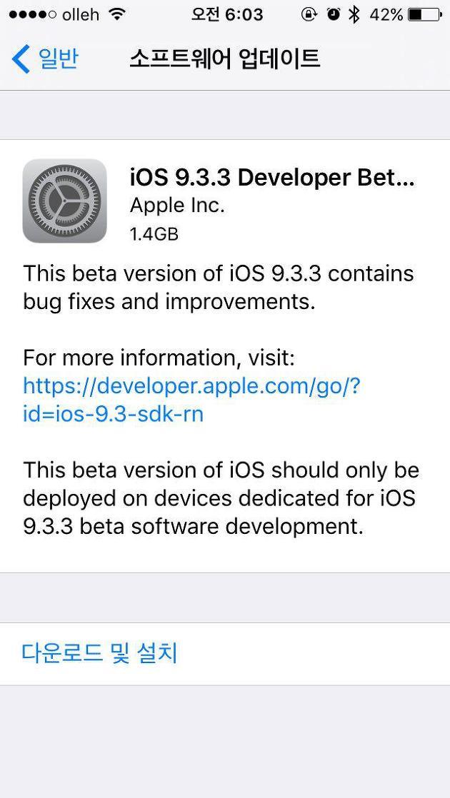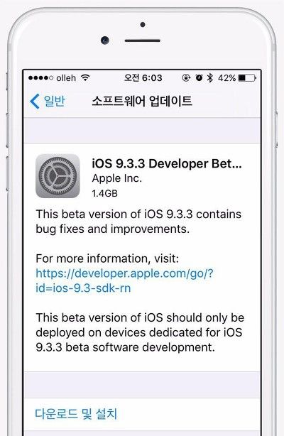 애플 개발자 등록한 분들은 https://developer.apple.com/ios/download/에서 프로파일을 다운로드 받아 설치한 후 설정>일반>소프트웨어 업데이트에서 업데이트를 진행하면 됩니다. 하지만 애플 개발자 등록을 하지 않은 분들도 프로파일만 있으면 iOS 9.3.3 베타2 버전으로 OTA 업데이트할 수는 있습니다.(아래링크참고)