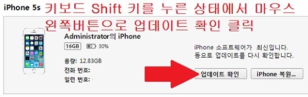 컴퓨터에 애플 기기를 연결한 다음 아이튠즈에서 Shift + 업데이트 확인을 클릭합니다. 그리고 위에서 다운받은 펌웨어를 선택하면 업데이트가 진행됩니다.(아래그림참고)