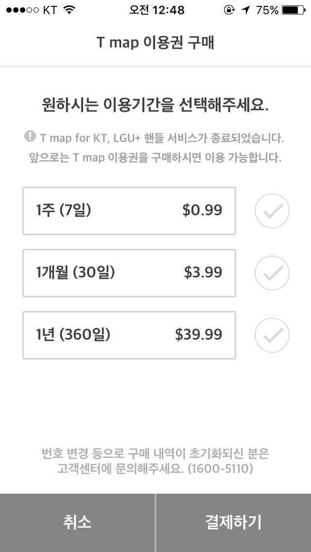아직 무료가 아니기에 앱스토어에서 티맵을 다운로드받아 실행해 보면 아래와 같이 T map 이용권 페이지가 나오는데요. 무료화가 되기 전까지는 1주(7일) 이용권만 판매한다고 합니다.
