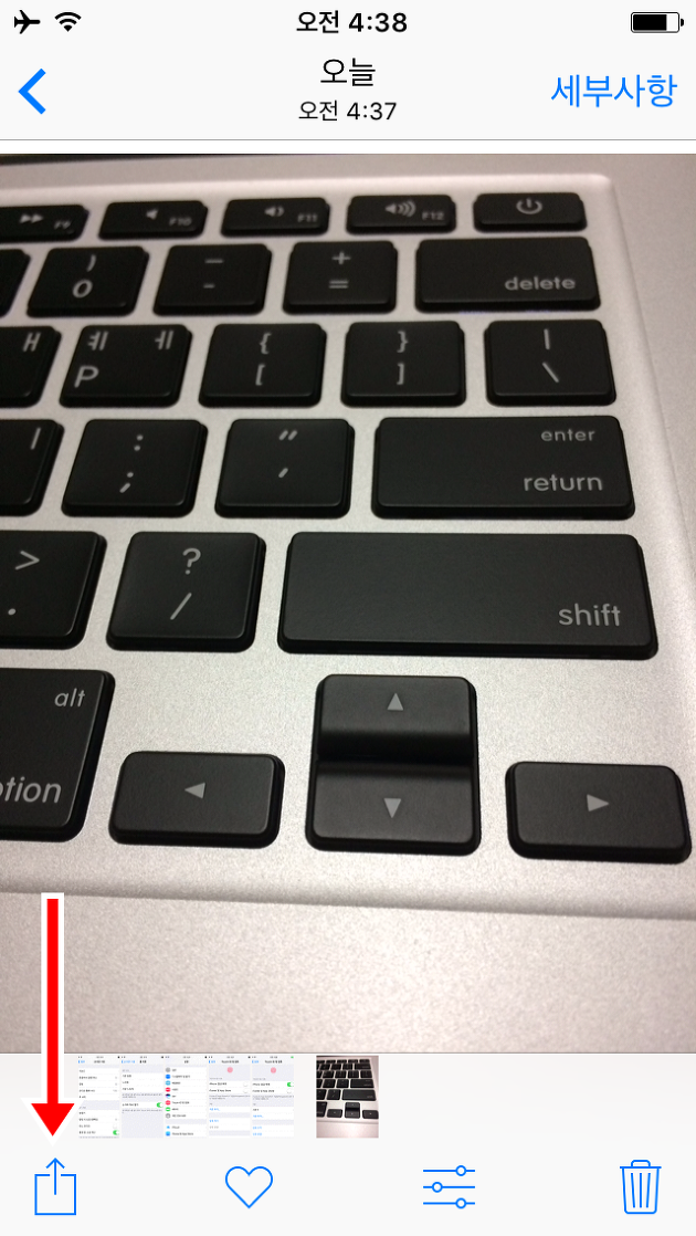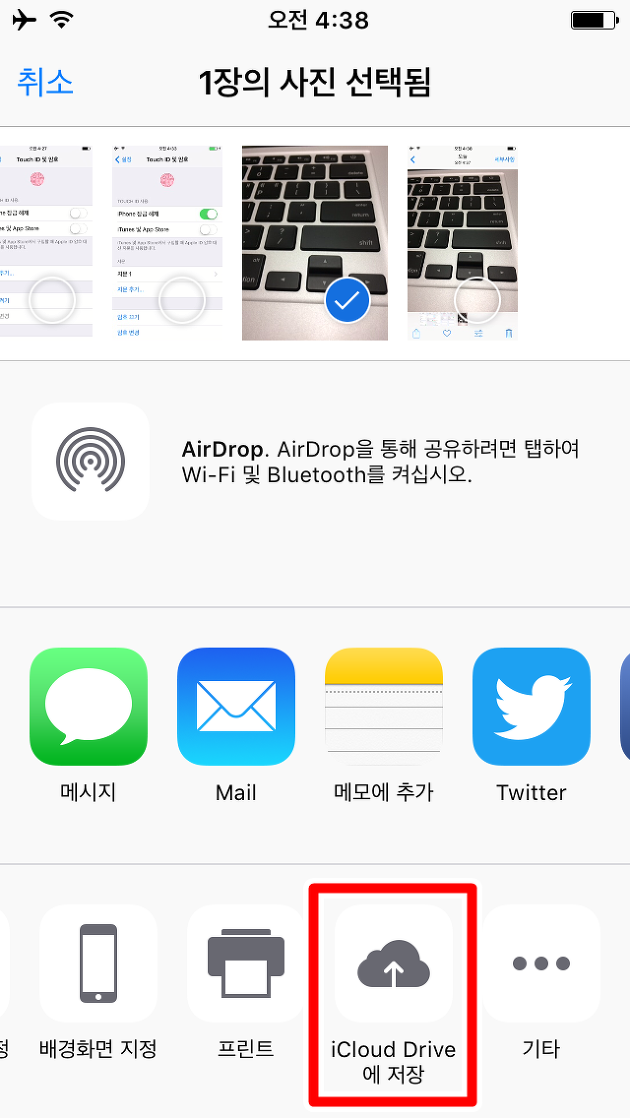 사진 앱 공유 메뉴에 iCloud Drive에 저장 버튼이 추가되었습니다. 아래와 같이 촬영한 사진을 iCloud Drive에 저장할 수 있습니다.