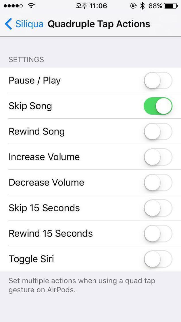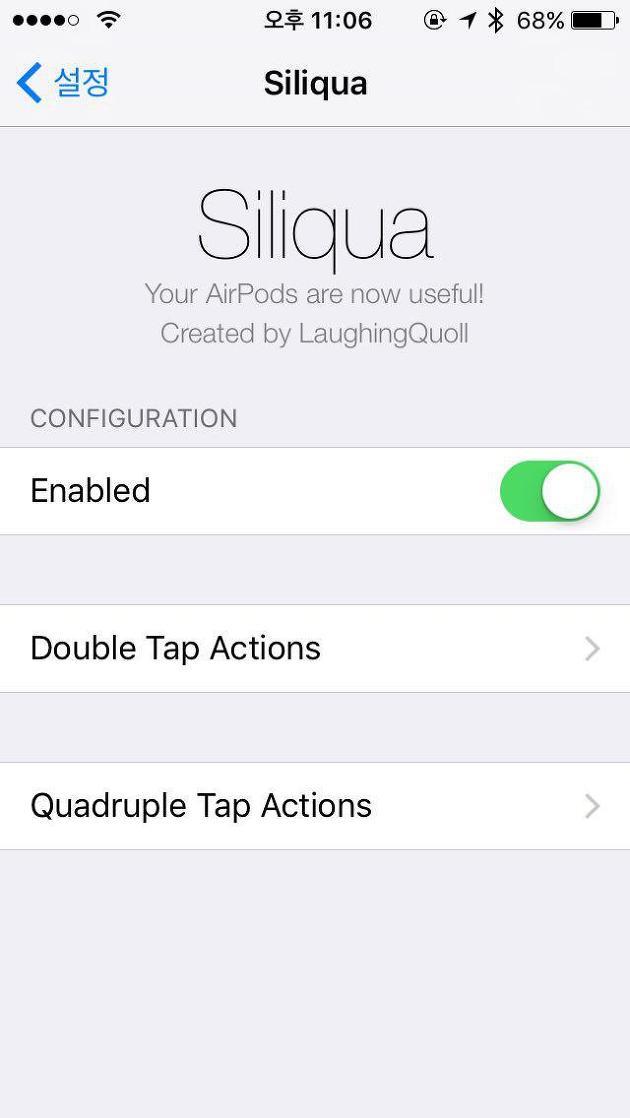 설치 후 아이폰의 설정에 들어가 보면 Siliqua 메뉴가 생기는데요. 거기서 에어팟의 이중탭 뿐만 아니라 사중탭(?)도 설정할 수 있습니다.