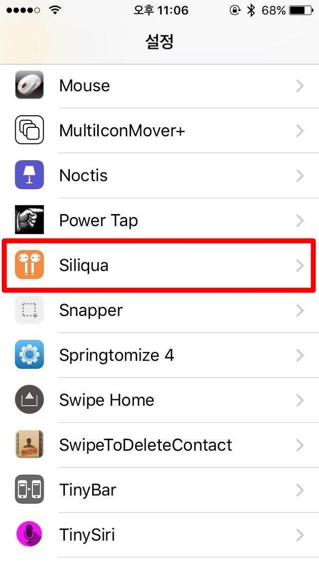 만약 Siliqua 트윅이 제대로 작동하지 않으면 아이폰을 리스프링한 후 사용해 보세요. 정상 작동할 겁니다.^^ 개인적으로 Siliqua 트윅을 사용하면서 느낀 점은 사중탭의 경우 너무 빨리 탭을 하면 잘 실행이 안되더라구요.^^ 참고하세요.