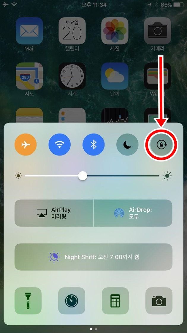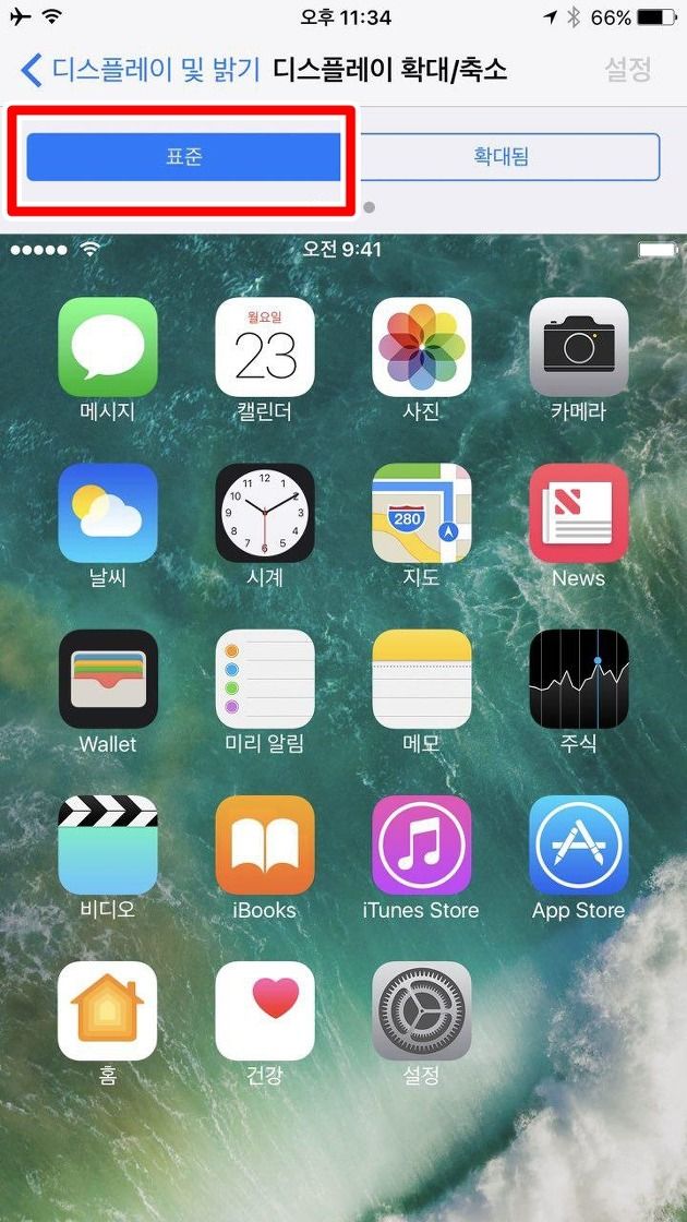 우선 아이폰7플러스의 설정>디스플레이 및 밝기>보기를 표준으로 설정하고 제어센터의 회전잠금을 해제 합니다.