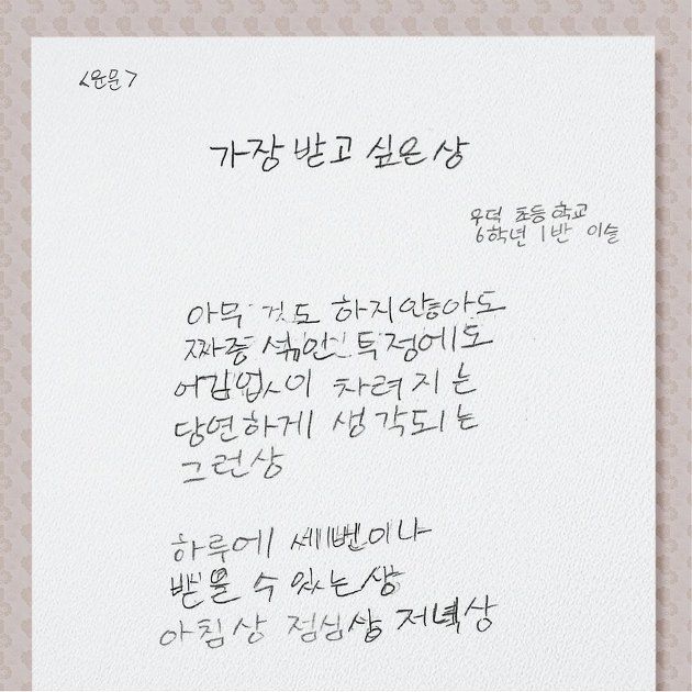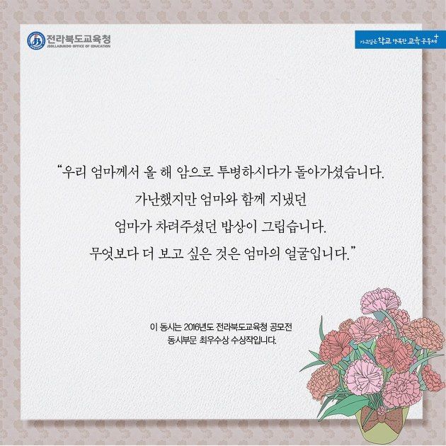 지난 5월 8일 어버이날, 전라북도교육청 페이스북에서 다시 한번 화제가 된 "가장 받고 싶은 상"이라는 동시를 소개합니다. 초등학교 6학년 학생이 지은 이 동시는 2016년 전라북도교육청 공모전 동시 부분에서 최우수상을 수상한 작품인데요.