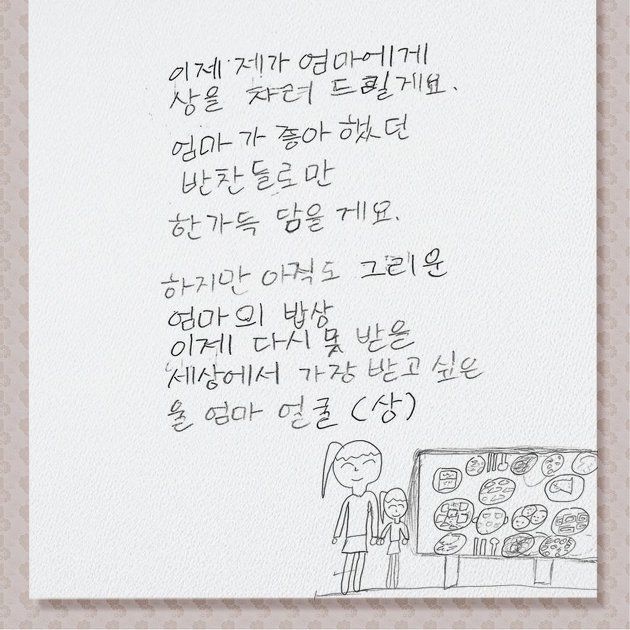암투병하다 하늘나라로 먼저 떠난 엄마를 그리워하며 쓴 시의 내용이 보는 이들의 가슴을 울렸습니다. 아직 읽지 못한 분들은 아래의 동시를 감상해 보세요.