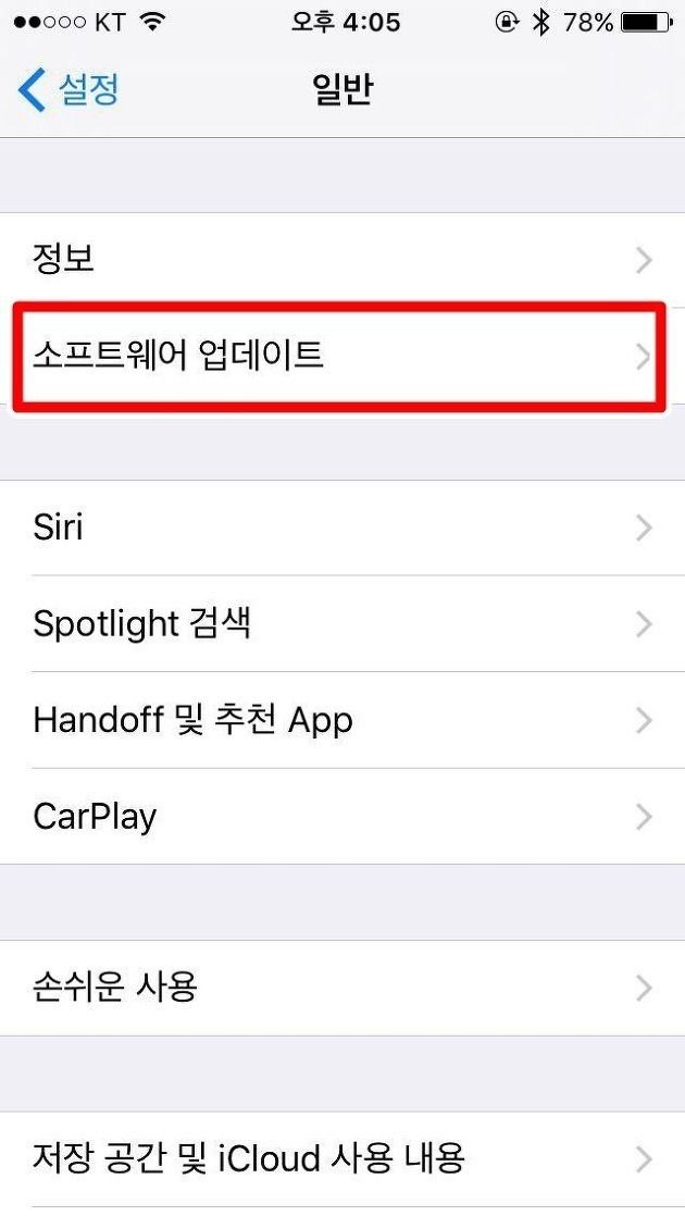 1. 설정>일반>소프트웨어 업데이트에서 업데이트 하는 OTA(기기내 업데이트) 방식